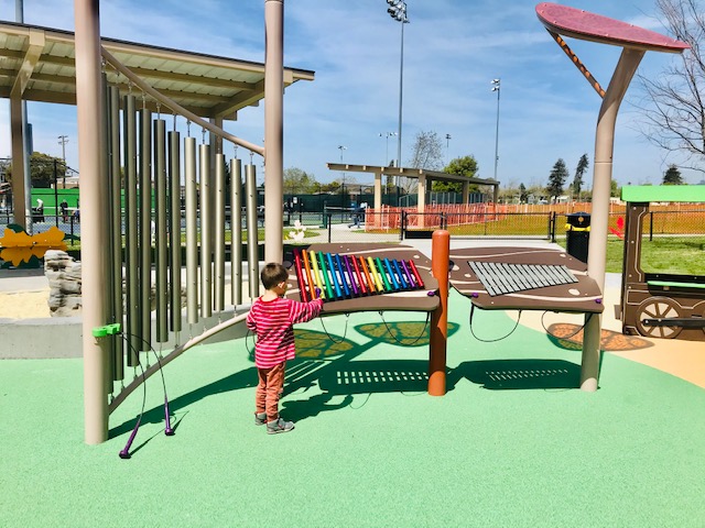 If your kids love playing in the sand, fear not, there’s a contained sand area with a water feature rock like the one at Totland (functional seasonally; bring extra clothes!). If you remember the old playground you’ll know the lack of shade was a definite drawback. Happily, there is a shade structure and seating near the sand area, as well as other shade elements as part of the tree house play structure. There’s also a cute little train and several playhouses for imaginative play.