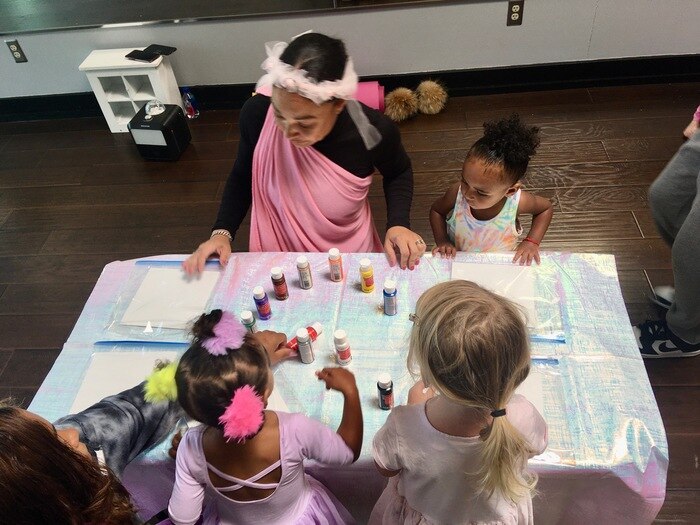 First, our instructor Carla (who is also the owner) led the kids through some simple yoga poses, then danced some wiggles out while singing some classic kids’ songs. All the movements were fun for my little one and within her capabilities. She especially enjoyed completing a few yoga poses set to a cute, custom song. The instructor was very positive and encouraging to all the little dancers. Overall, the movement portion of the class reminded me of a Cosmic Kids Yoga adventure. Parents and caregivers are welcome to join in or sit and watch.