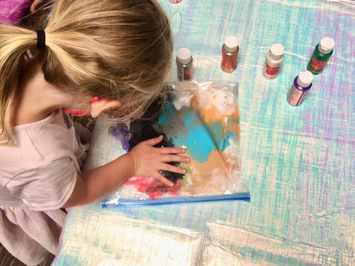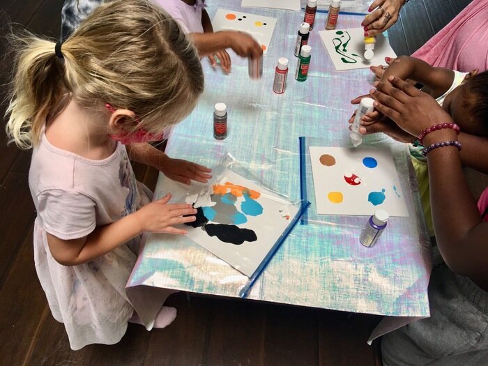 Next, we rolled up our yoga mats and began the art activity. The kids created a fun, sensory art project—painting in a bag. All the materials were laid out on a table that was just the right height for toddlers. Given that my child was dressed in a beloved costume, I appreciated how it was relatively mess-free. The kids were super engaged and excited to explore with the colorful paints.
