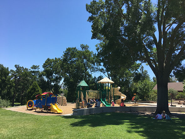 The playground is set in a circle, with benches along the perimeter – plus three tables with umbrellas – which fill up fast. It’s small enough for one parent to keep an eye on multiple kids. Though keep in mind that the gate is often left open and runners could easily move out of the spray pad area. The lifeguard on duty is very proactive and will ensure your children don’t run up the slide or climb on the spray statues; it’s also helpful to share these rules with kids before entering. Every time we’ve visited, the spray ground hasn’t been too crowded. However, there is a capacity of 60.
