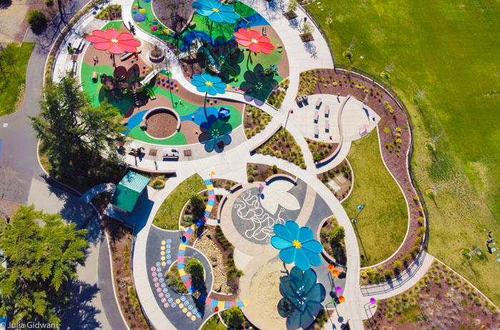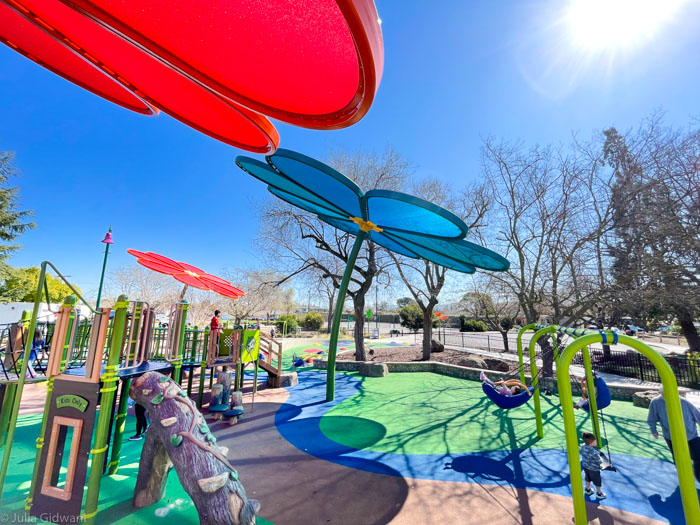 Livermore’s May Nissen Playground is fun, creative, colorful, and sprawling. Similar to Magical Bridge, it seems that May Nissen has a playground feature for any capability. It has an enchanting nature theme with eye-catching flower umbrellas, toadstool mushroom jumps, and forest-inspired play structures. The playful layout flows naturally into zones for younger children, older children, and even adults.