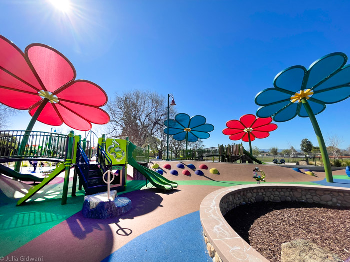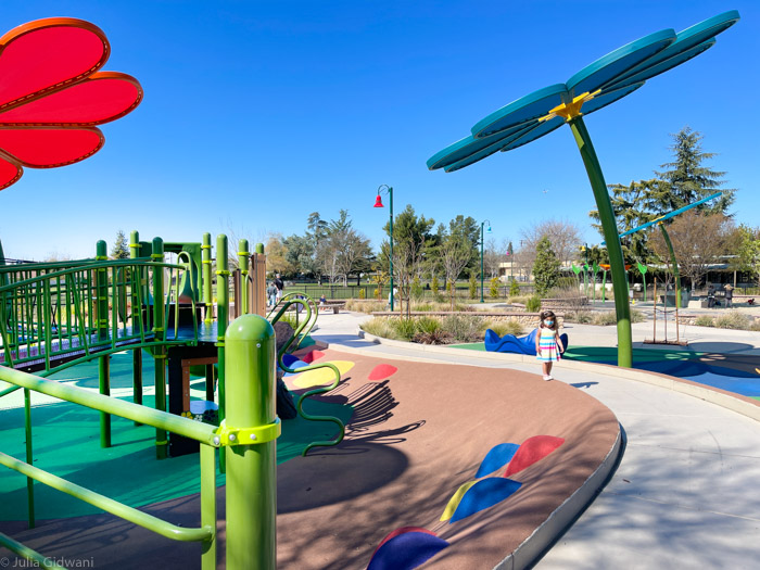 Shade: Thoughtfully placed giant, permanent, flower umbrella shades all throughout the playground. This playground is a pleasure to the eyes for this reason.