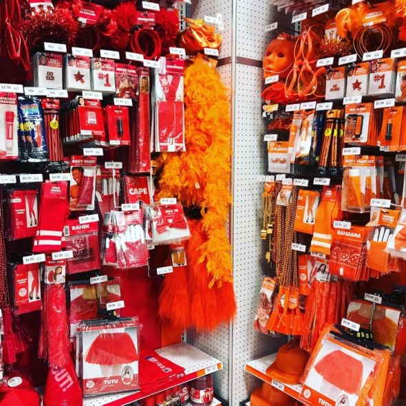 My favorite part is the color-coded section where customers can find accessories to complete their homemade costumes. Need red suspenders? No? Yellow suspenders? No? Yellow bowtie? Yes? You got it. Every color of the rainbow, plus a red, white, and blue section offers hats, face paint, knee socks, and wigs in those colors.