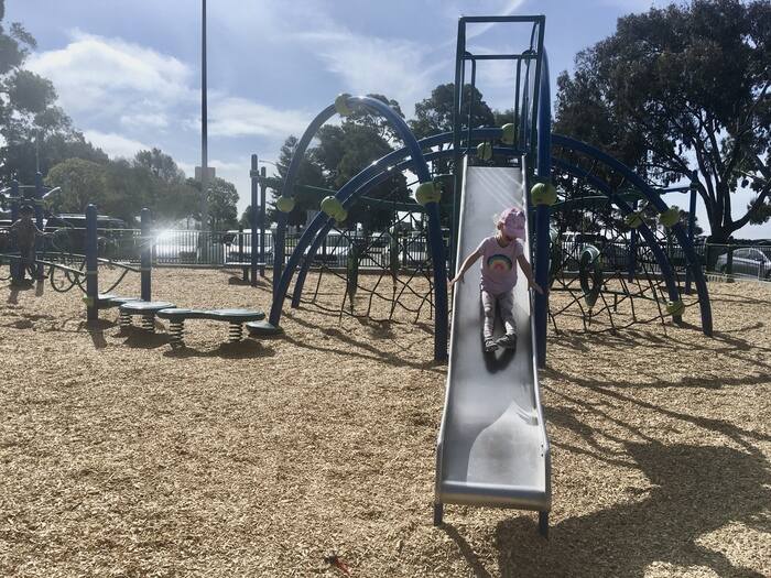 Surfaces: The playground has a combination of wood chips and a soft springy surface