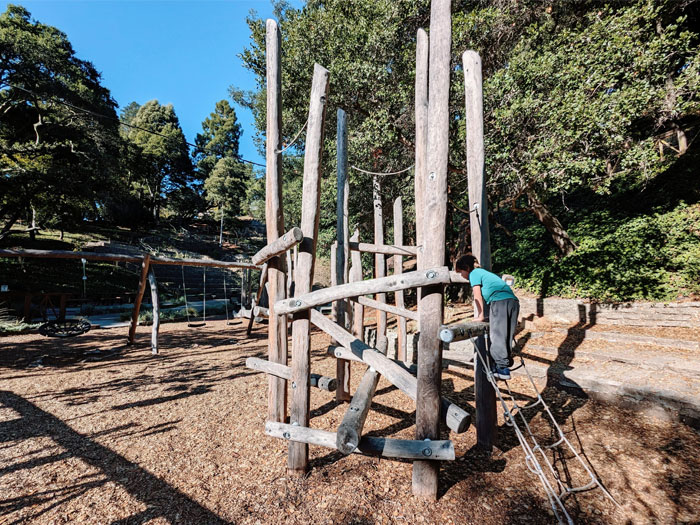 John Hinkel Park is best for younger children, so bigger kids may find the climbing and balancing a bit too easy. Still, the big theater, pathways, and swings may keep big brothers and sisters busy for a while. Per the City of Berkeley website: The theatre was used in the 1940s for community gatherings, music, and dance productions. It was the performance home for the Berkeley Shakespeare Festival from 1971-1991.